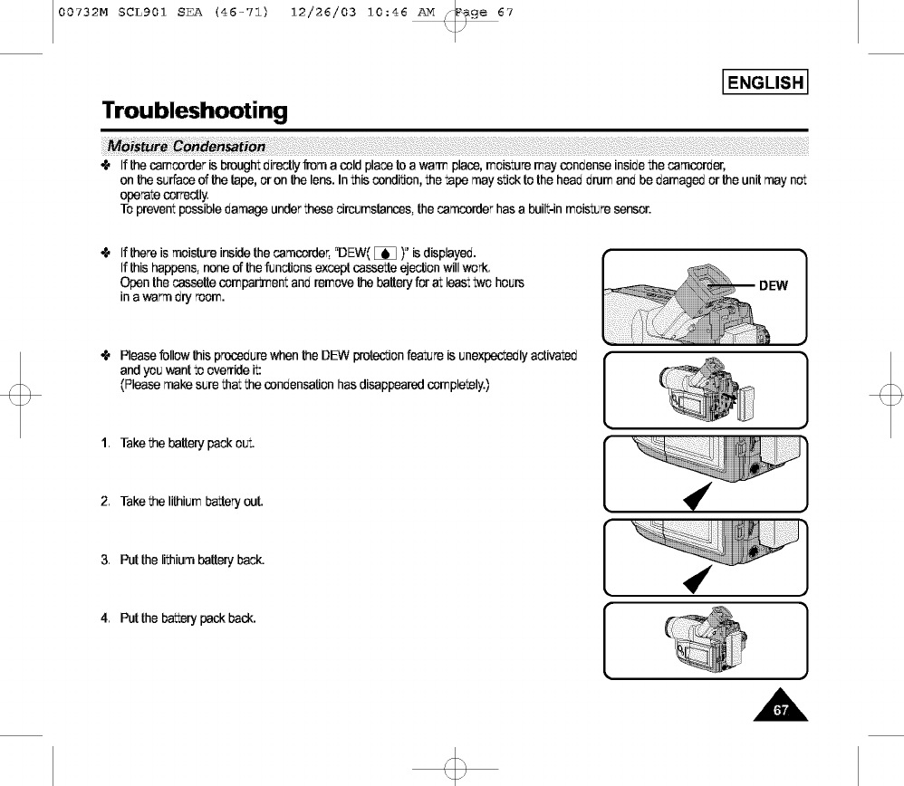 If there is moistureinsidethe camcorder,"DEW([_ )" isdisplayed.