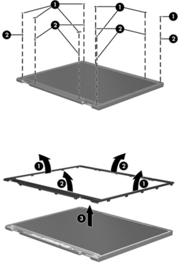1. Remove all screw covers (1) and screws (2) that secure the display bezel to the display