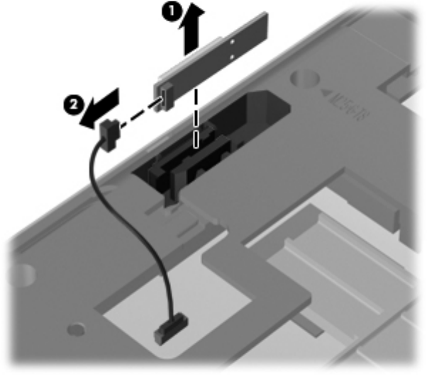 2. Lift the module straight up out of the computer (1), and then disconnect the cable (2) from the