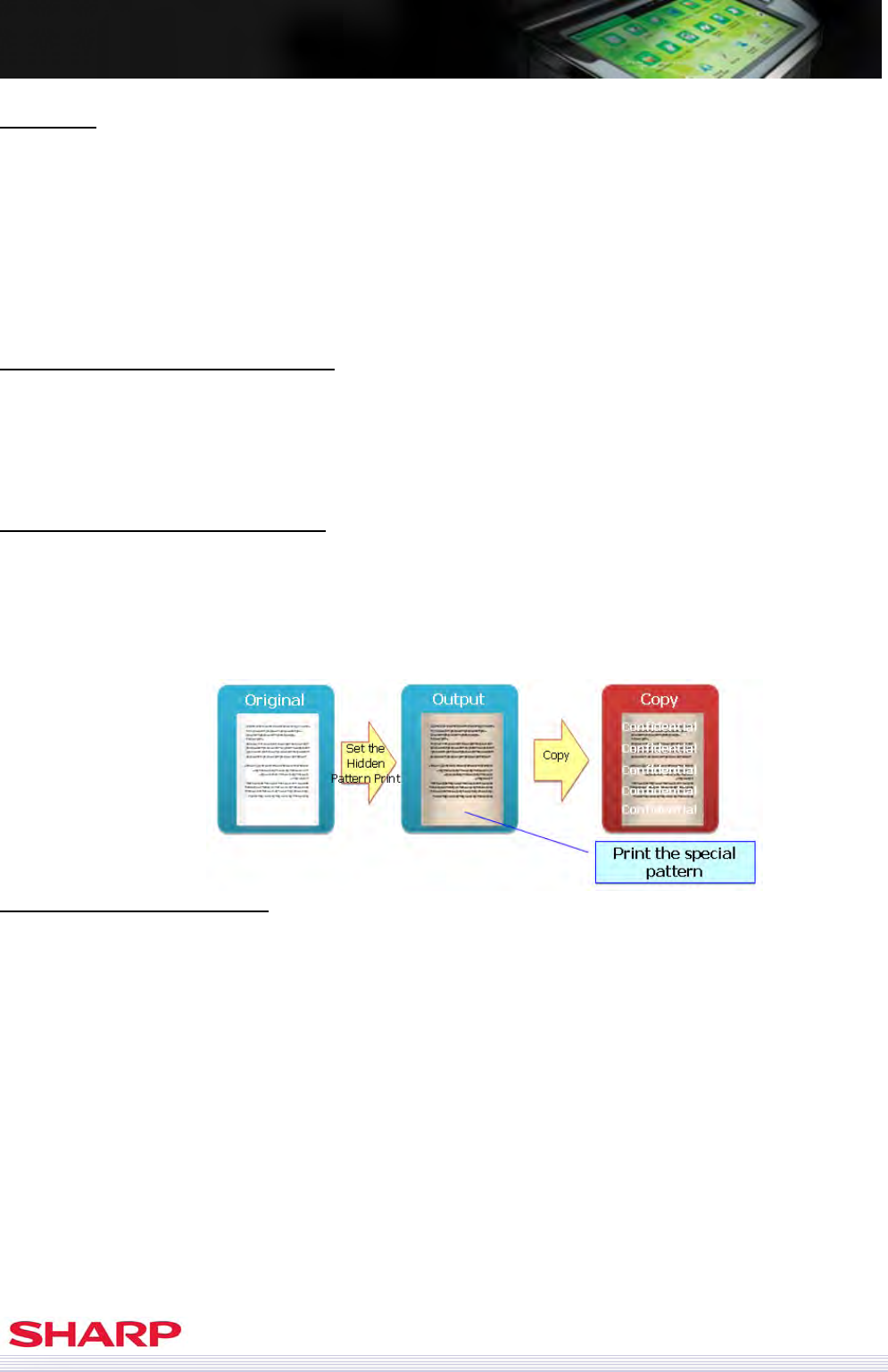 If the original is copied, the MFP detects this ‘pattern’ and prints the text across the original document. This feature