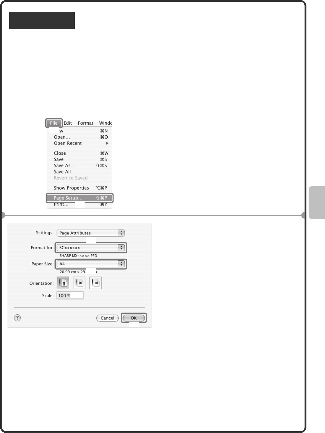 The following example explains how to print an A4 size document from "TextEdit" ("SimpleText" in Mac OS 9),