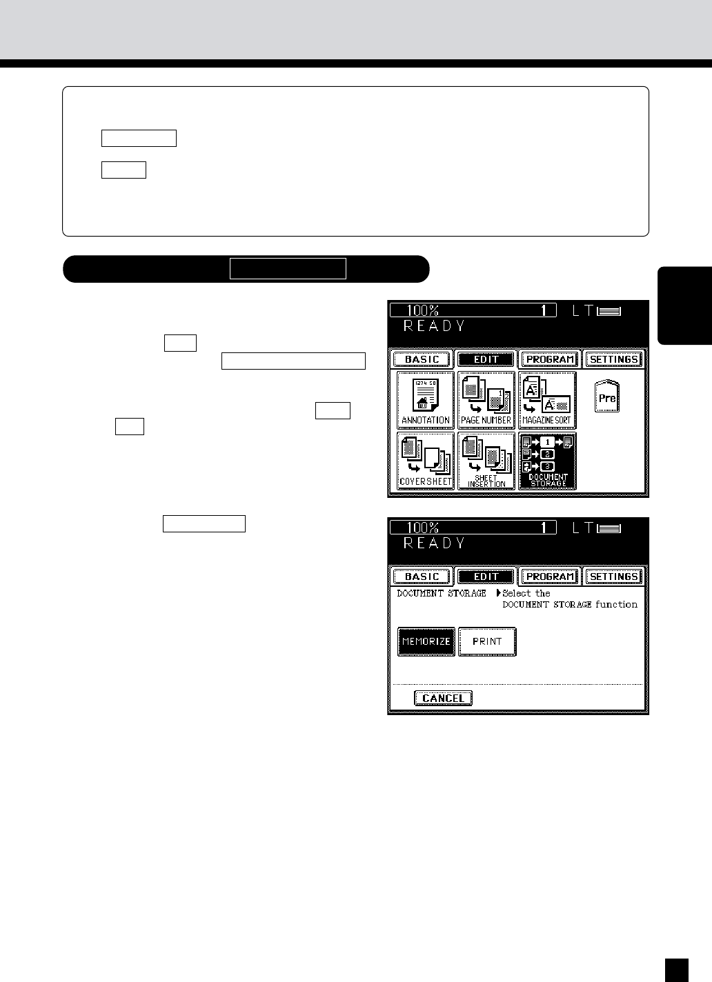 This function allows you to store the image of the originals on to the hard disk to be recalled