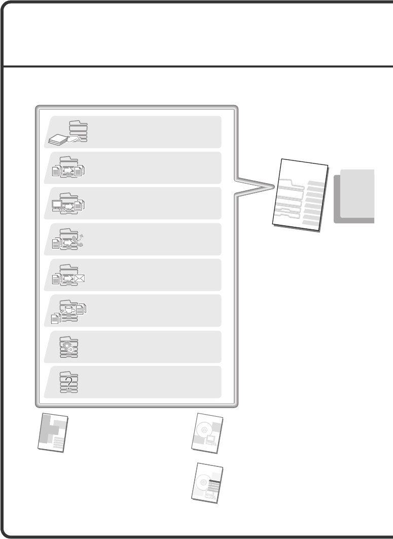 Three printed manuals and a manual in PDF format are provided with the machine.