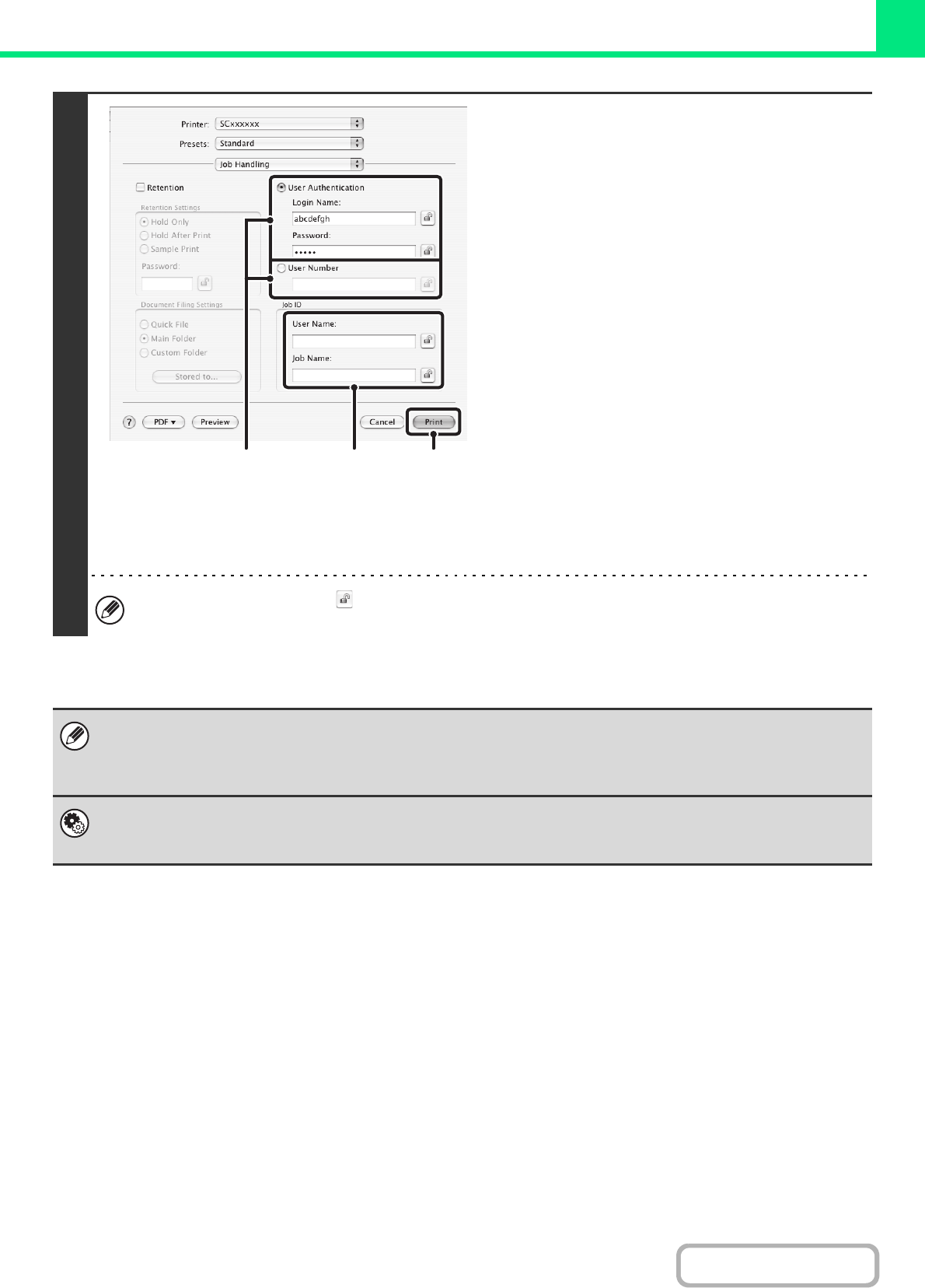 When user authentication is enabled in the system settings (administrator), printing is possible without entering user