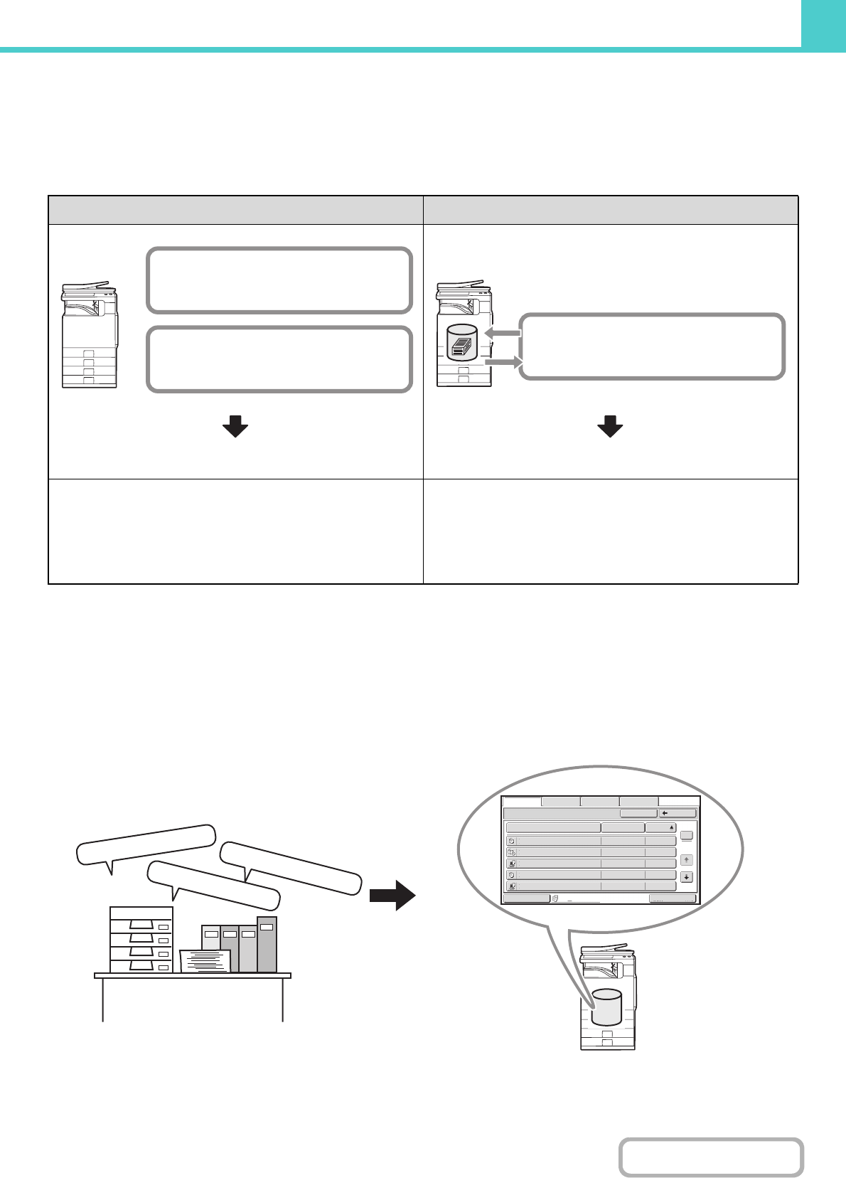 As shown in the example, storing a job with the document filing function frees you of the need to rescan the original and