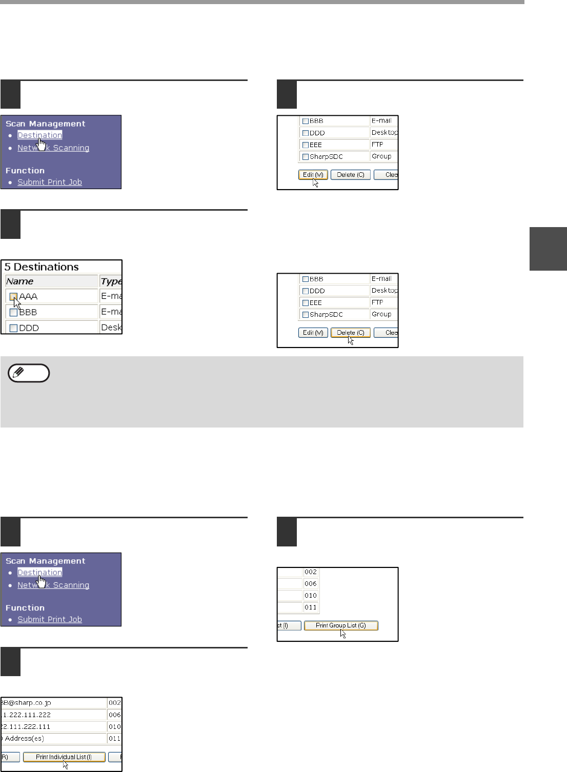 Print individual list: Shows the information programmed in e-mail, FTP, desktop, and group destinations.
