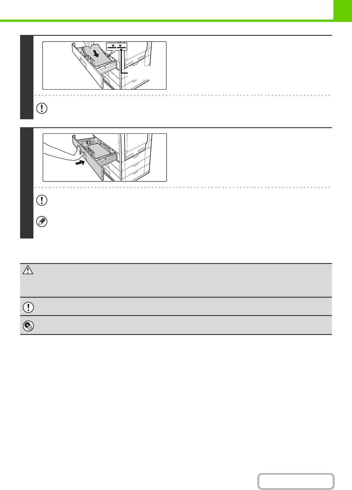 When pulling out a tray after paper is loaded, do not pull hard. The tray may be damaged, the machine may topple,